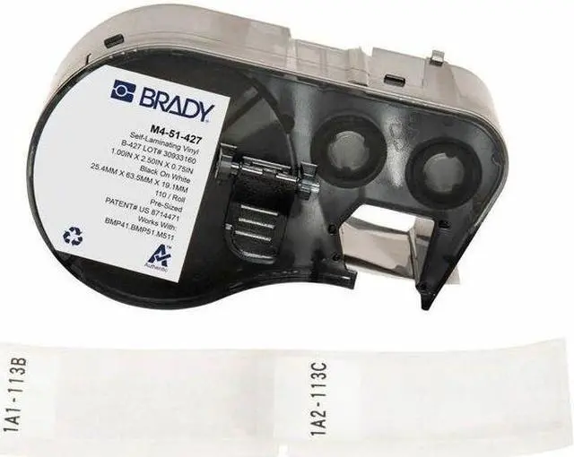 Mark cables and wires with the B-427 self-laminating vinyl label material, designed with a clear self-laminating protective layer. Print almost anywhere with a durable Brady portable label printer. Flexible - Designed for tightly-curved surfaces such as wires and cables Durable - Self-extinguishing and resistant to abrasion, solvents, oil, grease, weather and extreme temperatures Reliable - Made with a permanent acrylic adhesive that works great on smooth, rough, powder-coated and irregular surfaces Secure - Made with a clear, non-printable overlaminate for increased protection Certified - UL Recognized to UL 2238, RoHS compliant to 2011/65/EU (Pass 2015/863) For material specific performance and properties, please refer to the Technical Data Sheet (TDS)