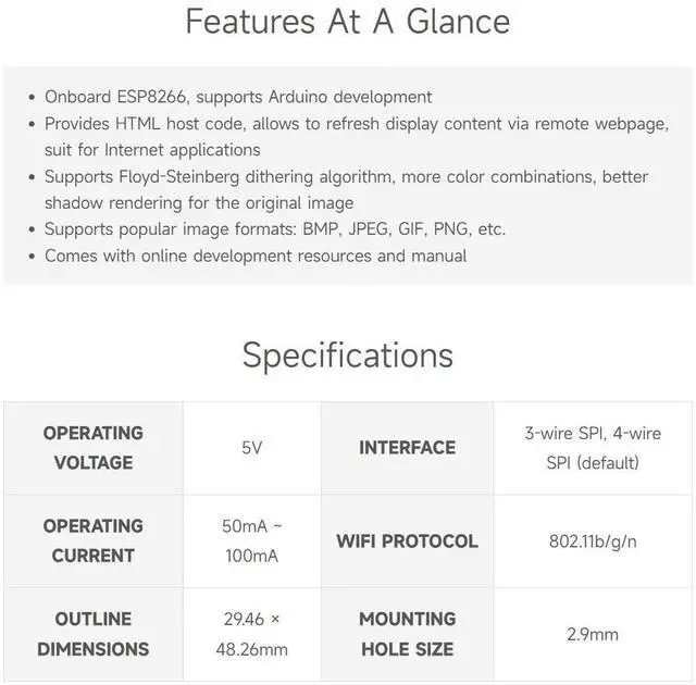This is a universal driver board for e-Paper raw panels, thanks to the WiFi connectivity, it is allowed to display images from PC / smart phone via WiFi conveniently. ^^ Furthermore, it can also be used for development, just like any other normal board. Onboard ESP8266, supports development ^^ Provides HTML host code, allows to refresh display content via remote webpage, suit for Internet applications ^^ Supports Floyd-Steinberg dithering algorithm, more color combinations, better shadow rendering for the original image.
