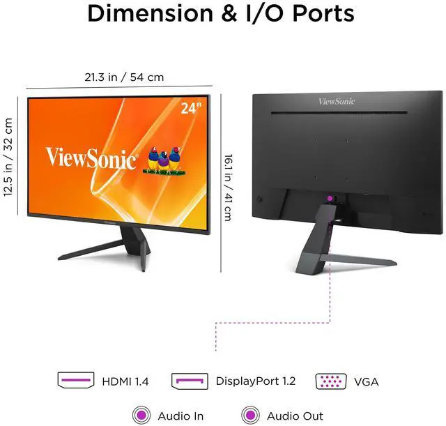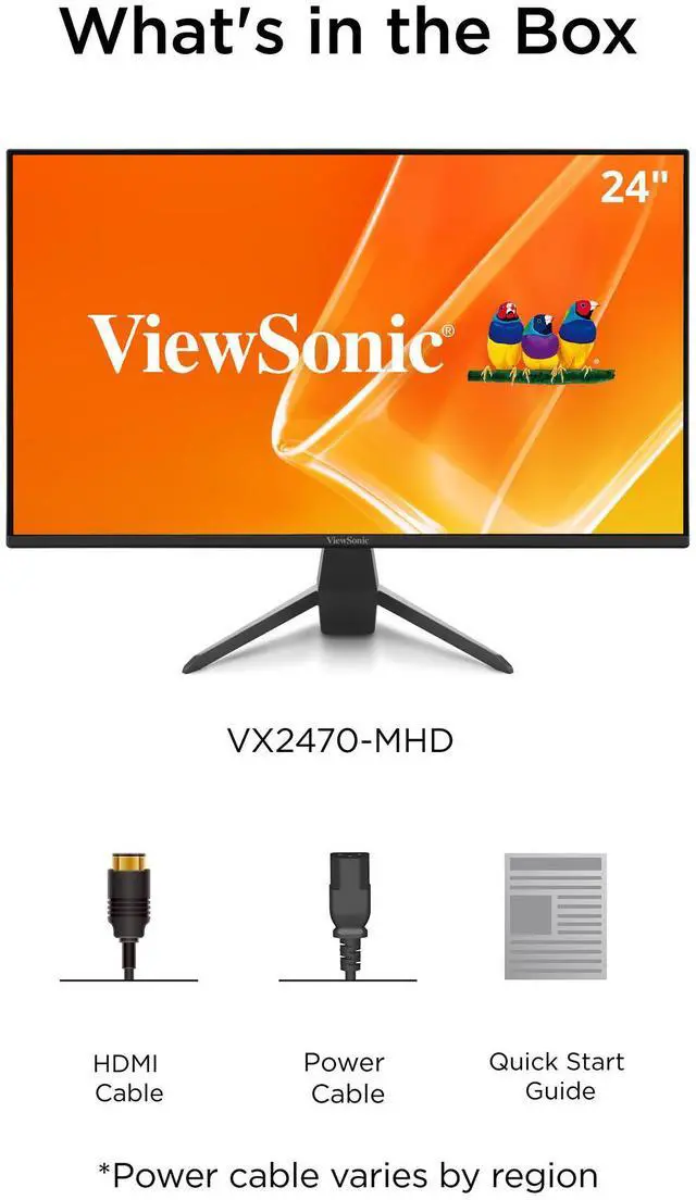 Featuring versatile connectivity and performance, the ViewSonic VX2470-MHD monitor is built for both work and play. Designed with SuperClear® IPS panel technology for wide-angle viewing and vibrant color, it delivers stunning visuals whether youre doing projects, watching a movie, or gaming. Its 3-sided frameless design enhances immersion in multi-monitor setups, while connectivity options including VGA, HDMI, and DisplayPort ensure compatibility with your favorite devices. Flicker-Free technology and a blue light filter help reduce eye strain during long sessions, while ViewSonics industry-leading 3-year limited warranty offers lasting peace of mind for home, office, and gaming use.