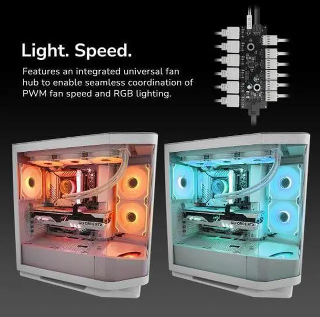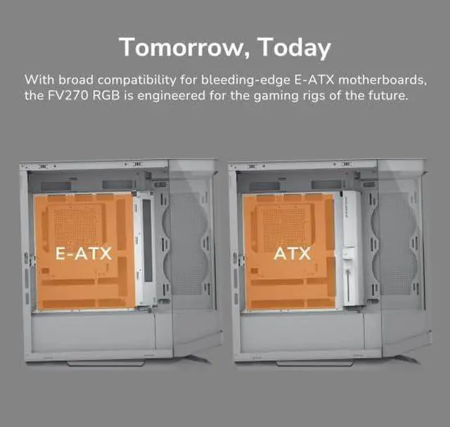 The FV270 RGB offers an unparalleled panoramic view of the interior with a tempered, curved glass perimeter. Unlike rectangular cases, this prism-inspired design eliminates obstructive straight edges and vastly increases transparency, amplifying both visibility and lighting brilliance.