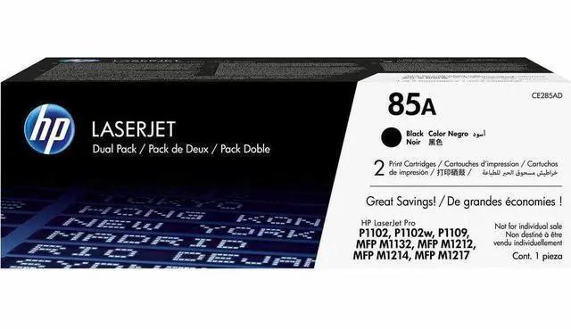 Print more affordablyOriginal HP LaserJet dual packs offer a better value than individual cartridges. Produce professional results time and again. Make a professional impression with crisp black-and-white documents. Maintain productivity and minimize downtime. Decrease shopping trips by choosing Original HP LaserJet dual packs instead of individual cartridges. DisclaimersProgram availability varies. Original HP cartridge return and recycling is currently available in more than 50 countries, territories, and regions in Asia, Europe, and North and South America through the HP Planet Partners program. For more information, visit