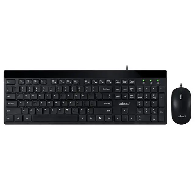 The Adesso AKB-140CB desktop keyboard and mouse combo delivers a complete wired input solution designed for office professionals, students, remote workers, and home computer users who value quiet operation and functional convenience. This full size USB keyboard features a 104-key US layout with low profile membrane keys and quiet switches that produce minimal typing noise, creating an ideal solution for shared office environments, open workspaces, libraries, and home offices where sound reduction matters. The integrated CoPilot AI hotkey enables instant access to Microsoft Copilot on compatible Windows 11 systems, streamlining your interaction with AI assistance tools.