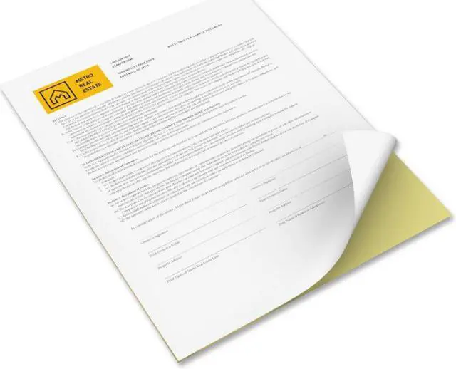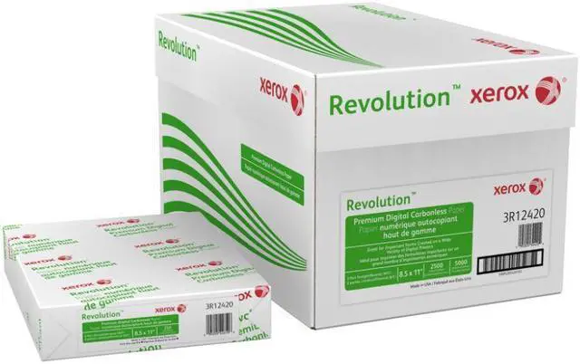This Xerox premium digital printer paper is a great way to create important forms on a wide variety of digital printers. Use it to make sure your office is fully prepared and ready to go before the start of a busy workday. 20-lb Xerox printer paper can be used for everyday copy and print jobs. Xerox premium digital printer paper can be used with a variety of digital printers. 92 brightness helps your text and images stand out. Revolution colored paper features capsule control technology that reduces contamination and enhances image quality. Carbonless paper has a 2-part, straight/reverse, white/canary design and comes in a carton of 2,500 sets.
