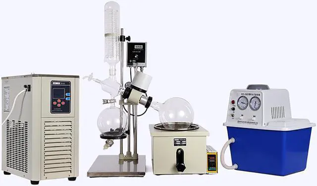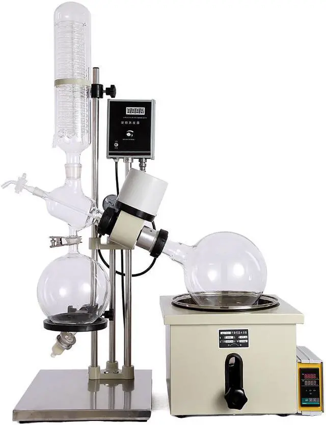 Rotary evaporators are distillation units that incorporate an efficient condenser with a rotary flask system. As the flask containing the solvent is rotated it continually transfers a thin layer of liquid over the entire inner surface. This gives a very large surface area for evaporation that is effected by heating from the accessory water or oil bath.