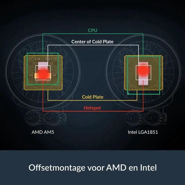 4. NATIVE OFFSET MOUNTING FOR INTEL AND AMD: Shifting the cold plate center toward the CPU hotspot ensures more efficient heat transfer