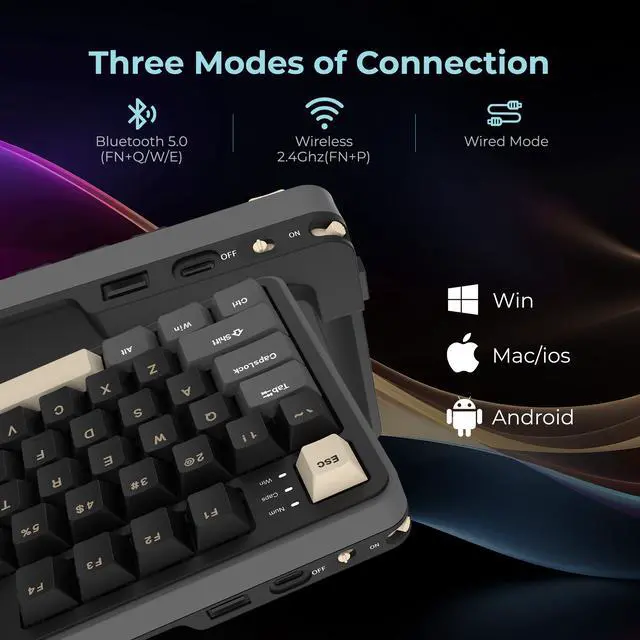 • Tri-mode connectivity (BT5.0/2.4G/USB-C) offers versatile, stable, and low-latency typing across multiple devices and platforms.