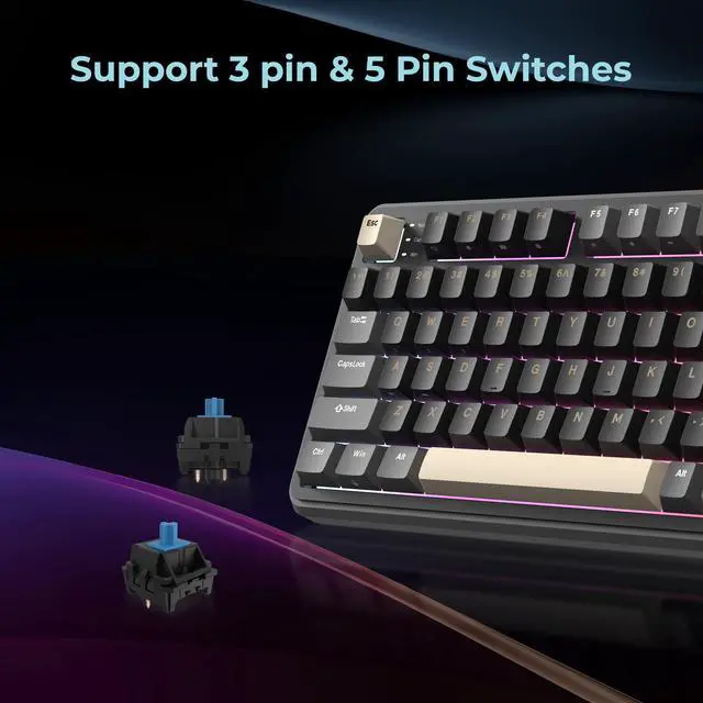 • Features hot-swappable sockets for 3/5-pin switches and double-shot PBT keycaps for lasting feel and fade-resistant labeling.