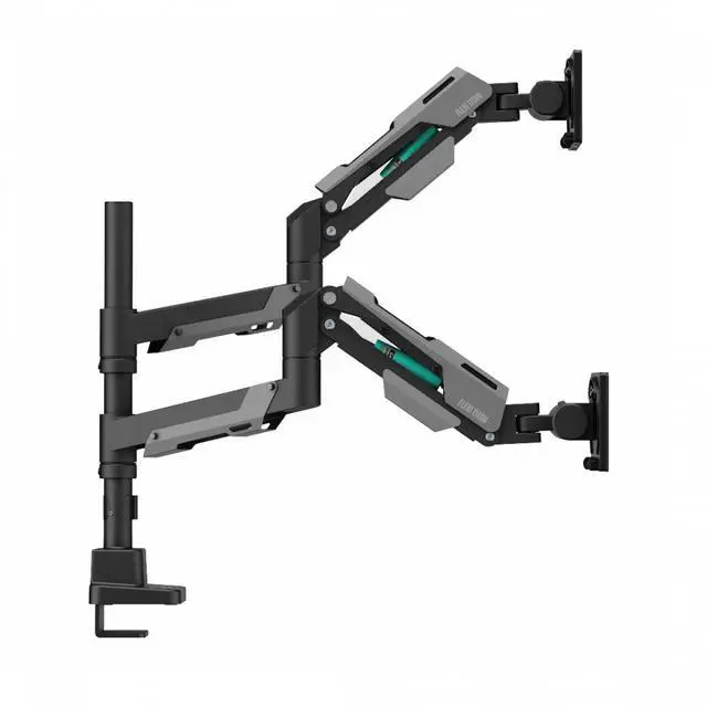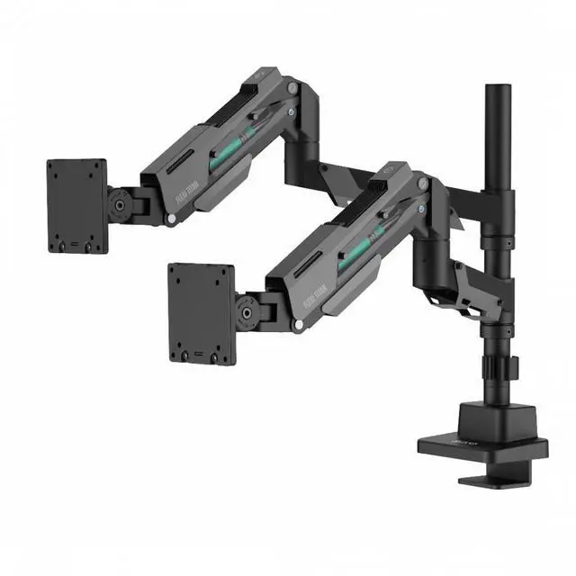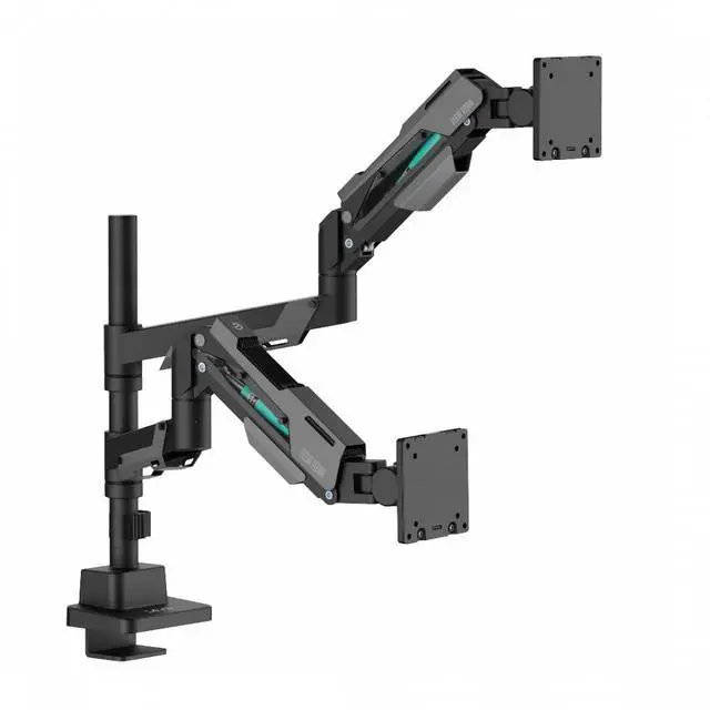 Make your workspace more productive and stylish with the Devo Flexi Titan Dual Arm Heavy-Duty Pole-Mounted Gas-Spring Monitor Arm. Designed with a futuristic industrial aesthetic, it features exposed gas-spring mechanisms that counterbalance the weight of two monitors for smooth, effortless adjustments. Each arm supports displays up to 27 kg, making it ideal for large flat or curved screens between 24 and 57.