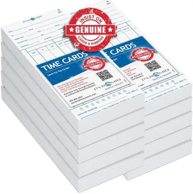 Pyramid Time Systems 3800-10MB Authentic and Genuine Time Cards are designed to work directly with the Pyramid model 3800 time clocks. Sold in 1,000 units per pack. Each card is set to record the following: Week Ending, Employee Name, Signature, Total Hours, Office Use Line, Date & Time, Total Payable Time, Rate, Amount, Earnings, Deductions and Balance. Week Ending, Employee Name, Signature, Total Hours, Office Use Line, Date & Time, Total Payable Time, Rate, Amount, Earnings, Deductions and Balance. This set of cards ships in a 1,000 pack and made with 30% post-consumer recycled content. Since 1969 Pyramid Time Systems has kept their eyes on the clock. Timekeeping has always been their solitary focus. Pyramid Time Systems has grown and matured into a respected authority in time stamps, time clocks, time and attendance software and synchronized wall clock systems, and all related accessories, including genuine Pyramid Time Systems time cards and time card racks.