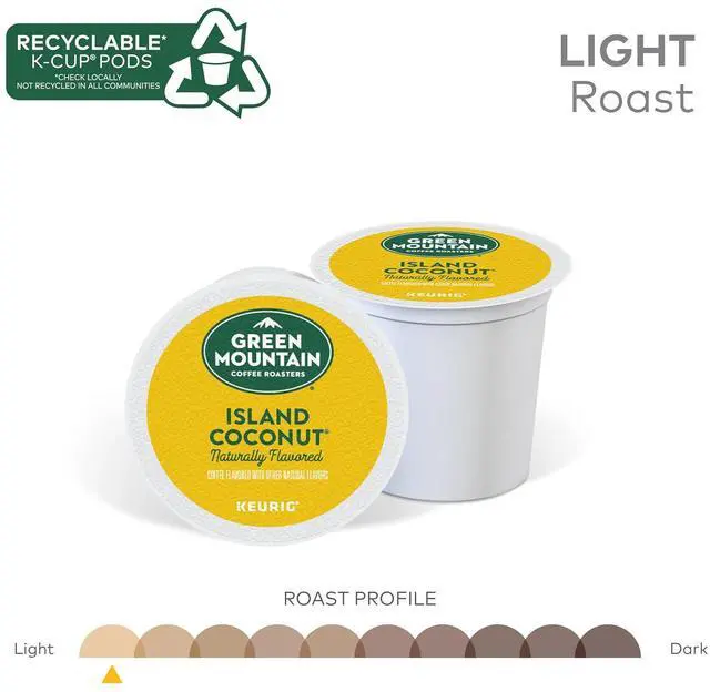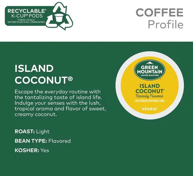 Island coconut flavor coffee indulges your senses with a delightfully fragrant, tropical taste treat of sweet, creamy coconut. The coffee captures the lush aroma of freshly grated coconut and blends it with the subtle sweetness of a lightly roasted, Central American coffee. Coffee comes in airtight K-Cups for single-cup brewing systems. K-Cups are easy to use. Simply shake and insert into the brewer for a delicious cup of coffee.