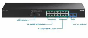 TRENDnet TPE-BG182g 18-Port Gigabit 470W PoE++ Switch - 8x 95W PoE++ Ports - 8x 30W PoE+ Ports - 2 Gigabit SFP Slots - 470W PoE Budget - 1U 19" Rack Mountable