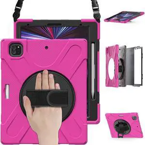 iPad Pro 12.9 Case 2022 2021, Shockproof Cover with Pencil Holder and Rotating Kickstand Hand Strap / Shoulder Strap For iPad Pro 12.9 inch 2022 2021 6th 5th Generation Rose Red