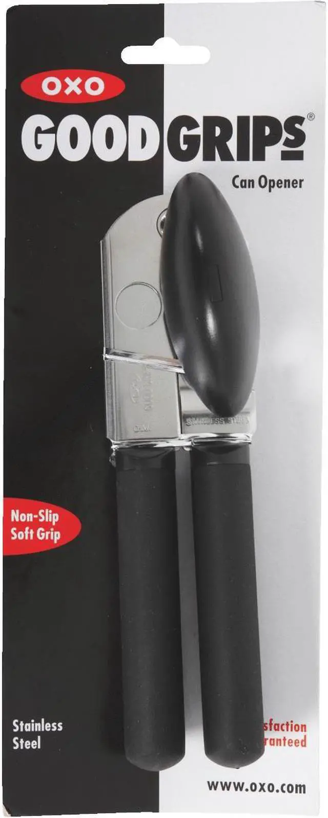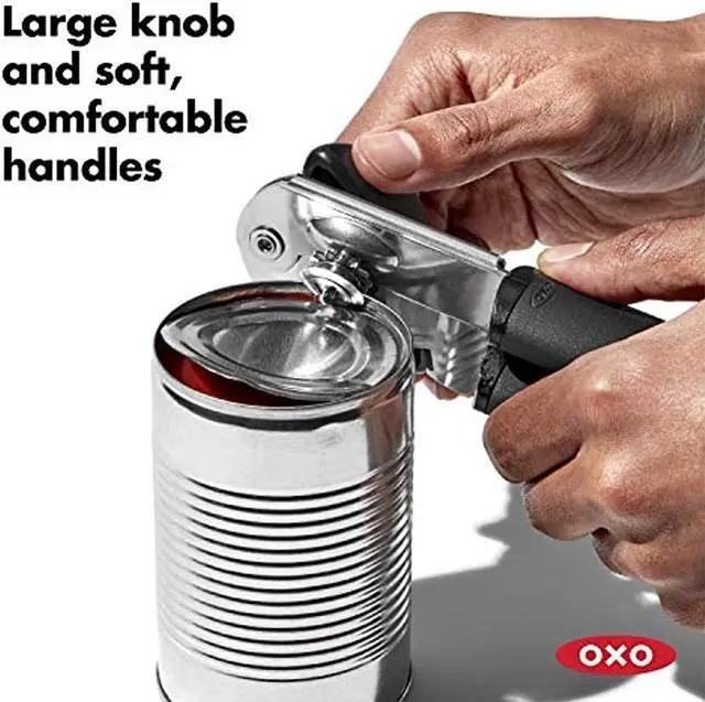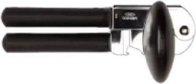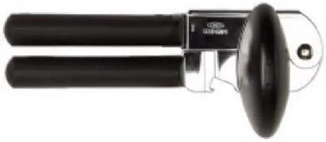 This can opener makes opening a can easy on your hands. Big cushioned handles give you extra strength to pierce a can, and the oversized knob turns easily. The sharp cutting blade is made of sturdy stainless steel and the soft, comfortable handles absorb pressure. This can opener also features a built-in bottle cap opener. From OXO International!