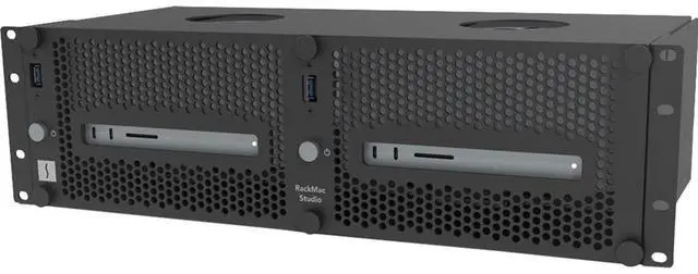 This rackmount solution is ideal for use in server rooms, thanks to its standard 3U height and standard mounting holes. The front panel operation includes dedicated power buttons for each Mac Studio computer, passthrough USB-A ports for connecting USB devices, and easy access to the computers' front ports and SD card slots. The RackMac Studio Pro 3U Rackmount Enclosure also features a unique storage space for Thunderbolt or USB SSDs (sold separately). This space, located beneath each Mac Studio computer, is secured with two included adhesive-backed magnets. Designed with portability in mind, the RackMac Studio Pro 3U Rackmount Enclosure has a 9.5 -inch mounting depth and firm rubber cushions to hold the Mac Studios securely in place during transport.