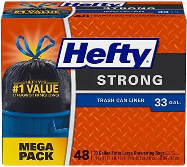 LARGE GARBAGE BAGSThis package contains 48 Hefty Strong large, black, unscented, 33 gallon multipurpose bags SUPERIOR PUNCTURE RESISTANCEComposed of signature Hefty quality and thick 1.05 millimeter plastic, these large trash bags help contain sharp indoor and outdoor debris TOUGHNESS YOU CAN TRUSTTackle everyday kitchen waste, post-party debris or your next big cleanup project with these strong, versatile drawstring trash bags DEPENDABLE DRAWSTRING CLOSUREThe durable drawstring on these plastic garbage bags makes it easy to transport heavy loads of donations, seasonal items and more to the curb