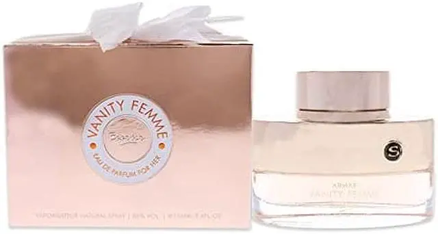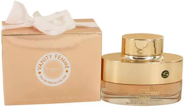 • Launched by the design house of Armaf. Armaf Vanity Femme is a mesmerizing fragrance of love, romantic and sensual elixir for those who enjoy infatuation and love. Floral top notes open with sensual essences of jasmine, bitter orange wrapped in sweet notes of peach