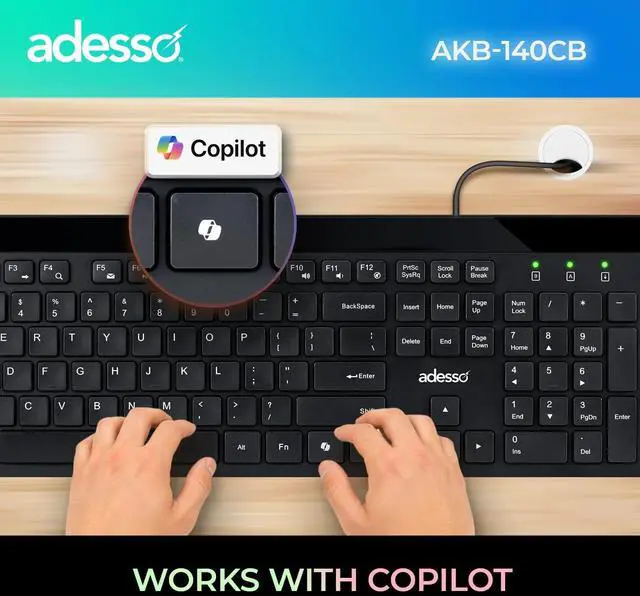 The Adesso AKB-140CB desktop keyboard and mouse combo delivers a complete wired input solution designed for office professionals, students, remote workers, and home computer users who value quiet operation and functional convenience. This full size USB keyboard features a 104-key US layout with low profile membrane keys and quiet switches that produce minimal typing noise, creating an ideal solution for shared office environments, open workspaces, libraries, and home offices where sound reduction matters. The integrated CoPilot AI hotkey enables instant access to Microsoft Copilot on compatible Windows 11 systems, streamlining your interaction with AI assistance tools.