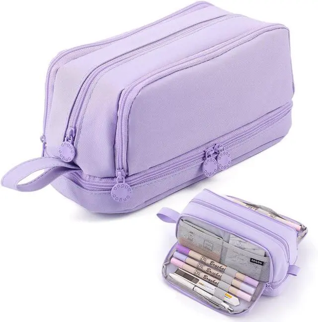 Large capacity with 4 compartments, middle, front, back and bottom pocket in one. It can store up to 100+ colored pens or pencils and other stationery, such as sharpener, calculator, rubber, sticker, ruler, etc.