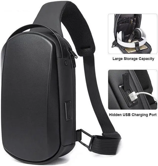 Hidden USB Connector(Power Bank Needed): Dustproof and waterproof, is set on the side of the sling bag, to set up a transfer mechanism between the power bank and your mobile phone. It can charge your device more conveniently and gracefully .