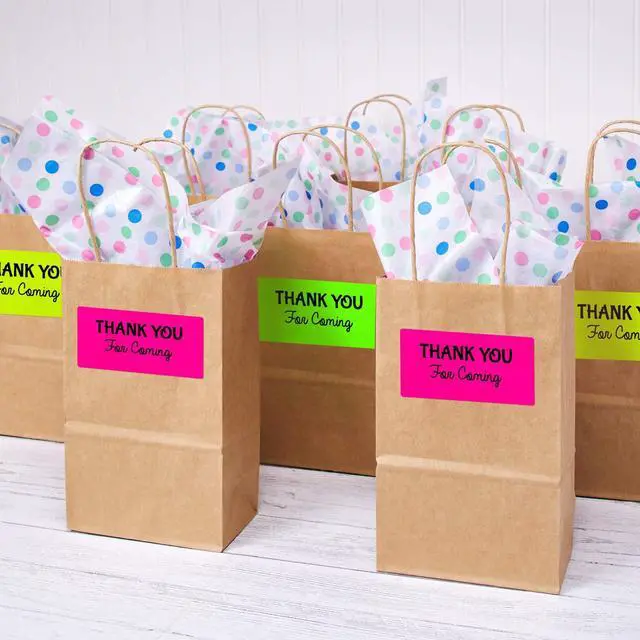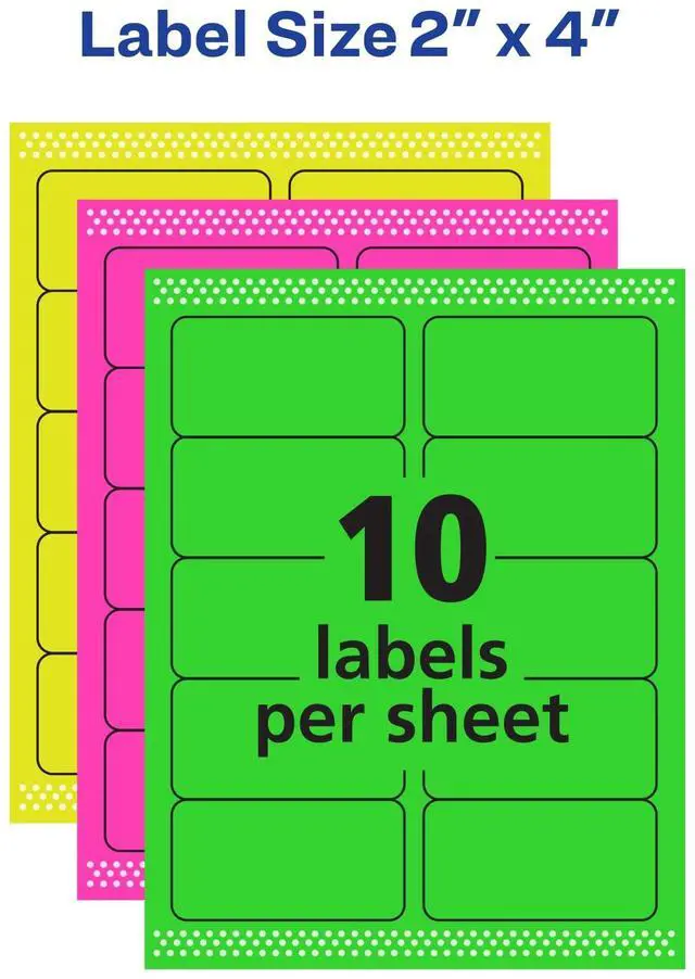 Make your next project or shipment stand out with the assorted pack of neon green, pink, and yellow 2 x 4 labels. Use the bright neon labels to create product labels, student name tags, beauty product labels, Christmas mailing labels, food labels, barcode labels, price labels, return labels, and more. Expect high-quality, smudge free printing results with neon shipping labels from Avery that are optimized for laser printers.