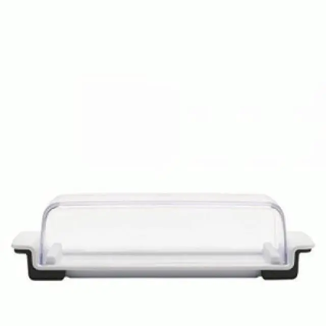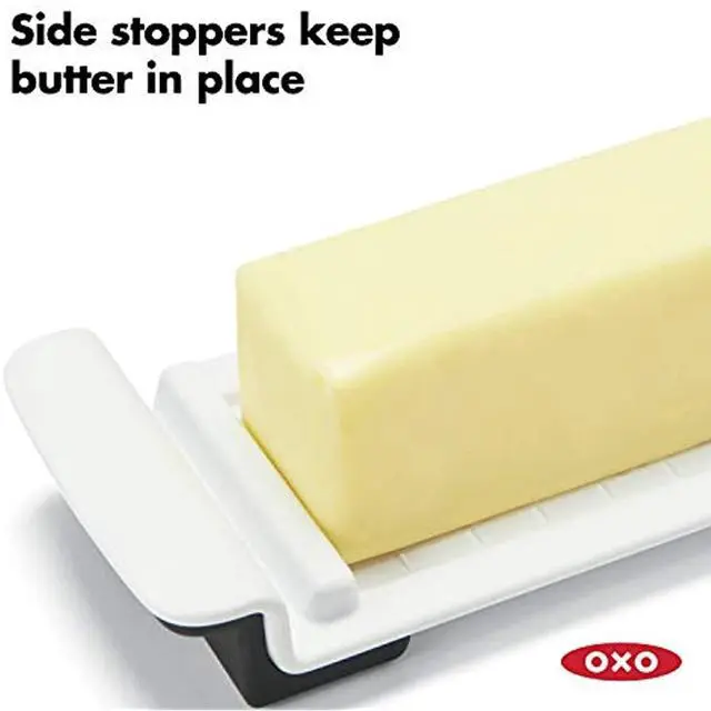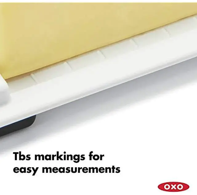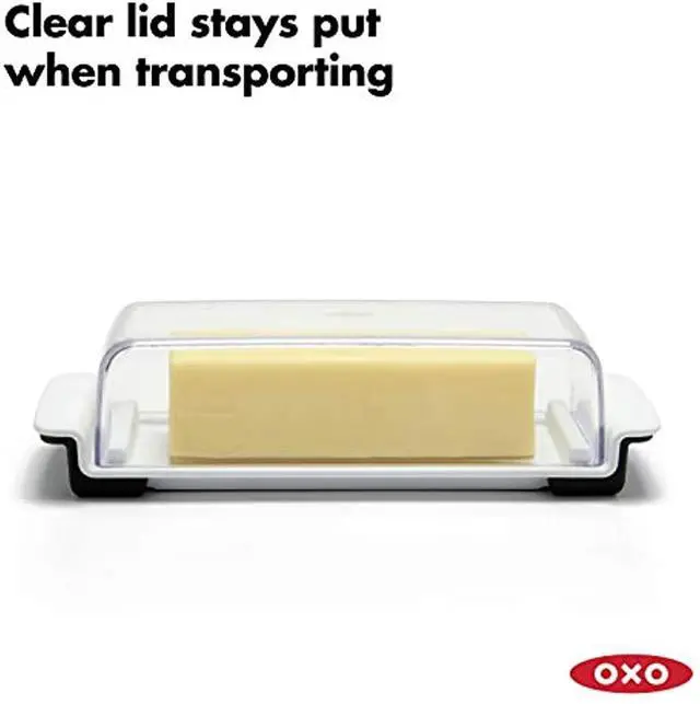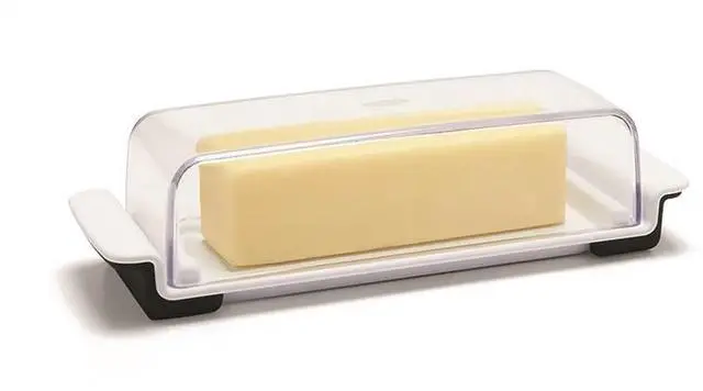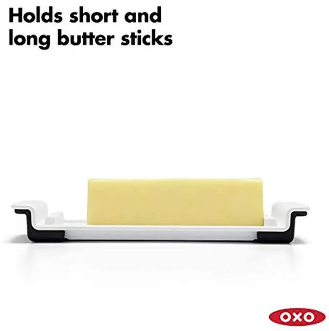 Stoppers on either side of dish keep butter in place while cutting. Convenient tablespoon measurement markings. Clear lid rests on dish without sliding off during transport and is easy to remove. Dish designed to keep butter from slipping off tray and dirtying lid. Accommodates all short and long 4 oz butter sticks. Soft comfortable non-slip grips. Durable body and lid are dishwasher safe. BPA free.