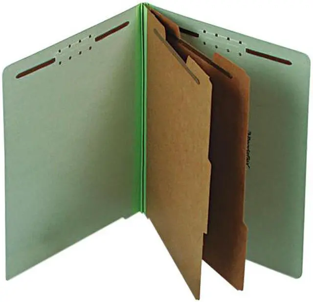 Pressboard Classification Folders feature built-in dividers that separate related documents inside the same folder. Full end-tab design is perfect for filing in shelf systems. Two dividers provide six-section filing. Letter-size folders are made of sturdy, 25 point pressboard. Dividers are made of durable, 17 point Kraft. Folders have 2" capacity embossed fasteners in positions No. 1 and 3. Dividers have a 1" capacity and a fastener in the No. 1 position. Folders have 2" tape-reinforced gussets to prevent ripping and tearing.