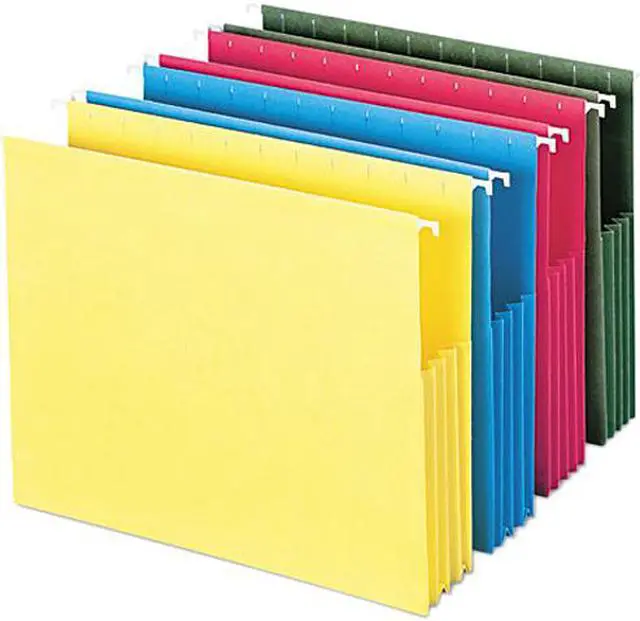 Hanging pockets are ideal for storing large amounts of paperwork for a single subject that needs to be frequently removed from the file drawer. The sturdy sides and bottom expand to hold up to 3-1/2" of letter-size material and keep papers from falling out when the file is being transported. Assorted pack includes one each: blue, red, standard green and yellow. Hanging pockets also include repositionable, clear poly tabs for easy indexing.