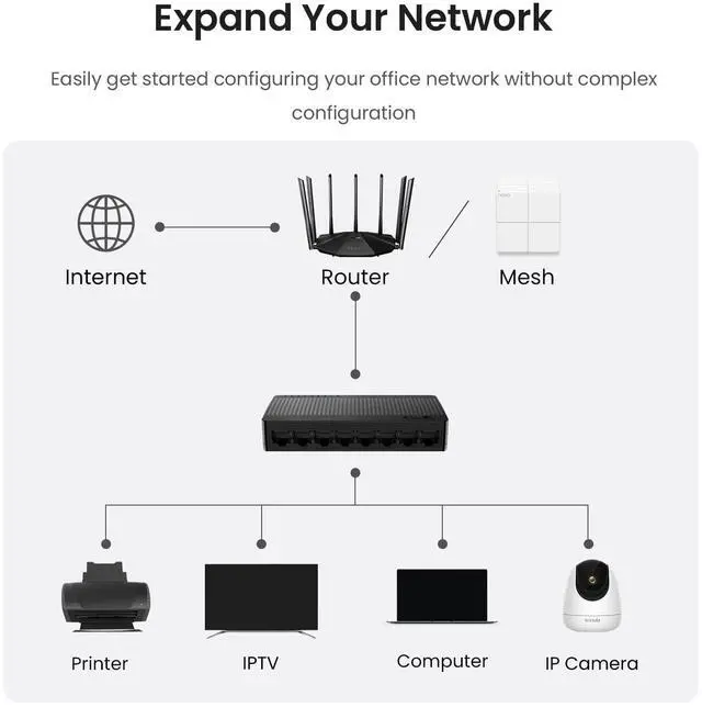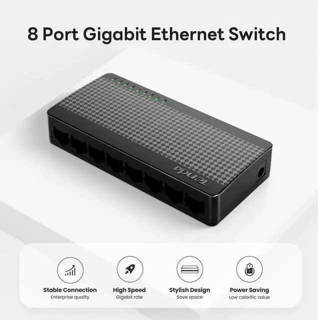 Tenda 8-Port Gigabit Ethernet Switch - 8 Ports - Gigabit Ethernet - 10/100/1000Base-T - 2 Layer Supported - Twisted Pair - Wall Mountable, Desktop