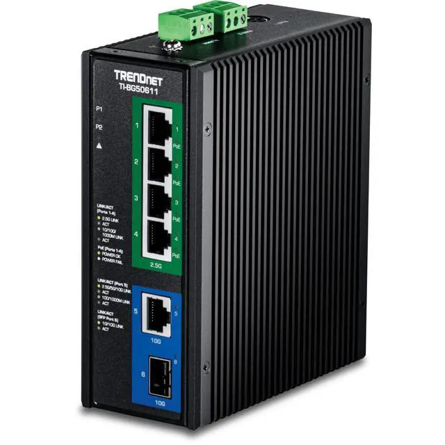 TRENDnet's 6-Port Industrial 2.5G PoE++ DIN-Rail Switch with 10G Ports, model TI-BG50611, delivers network connectivity to rugged environments, while saving you on installation costs and setup time using Power over Ethernet technology. The industrial multi-gigabit PoE++ switch features a rugged IP50 rated metal enclosure, designed to withstand a high degree of vibration and shock, while operating in both high and low temperatures for industrial environments within -40° 75° C (-40° 167° F). This hardened industrial PoE++ switch features four Ethernet 2.5G PoE++ ports, a 10G Ethernet port, and a 10G SFP+ port for long distance fiber networking applications.