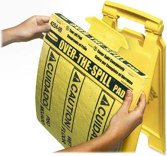 Over-The-Spill pads immediately warn pedestrians of a walking hazard in both English and Spanish while absorbing up to 12 oz. of spilled liquids, including water, oils and most solvents. Pads are made of polypropylene for added strength and absorbency. Pad tablet fastens to floor signs or mount to walls. Floor sign stands are sold separately.