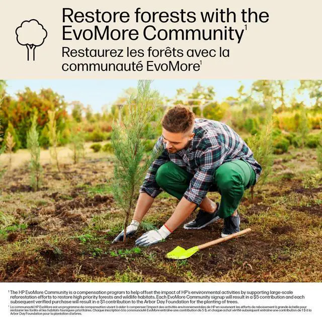 Purchase and registration of your first HP EvoMore Original Ink Cartridge with EvoMore Community sign up will result in a $5 contribution, and each subsequent verified purchase will result in a $1 contribution to the Arbor Day Foundation for the planting of trees.