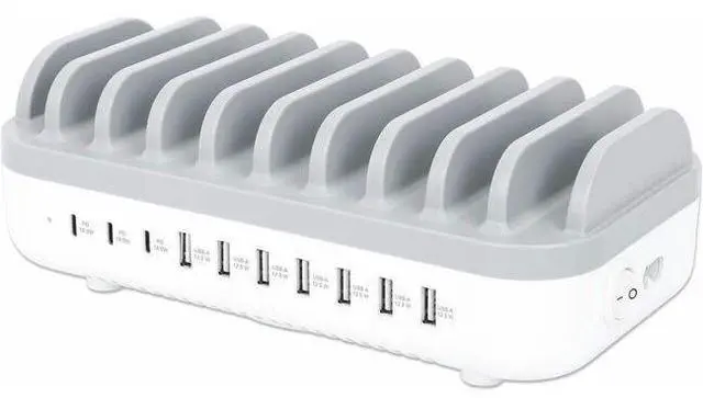 Desktop Charging Station - smart and fast power for USB-C and USB-A devices The Manhattan 10-Port USB Charging Station keeps USB-powered devices - tablets, phones, cameras, Bluetooth headphones and portable game consoles - charged and ready to go. It plugs into any standard wall outlet and offers rapid charging, so it's perfect for home, school and office use. To help with organization, ten wide bays fit most devices in their cases, keeping the countertop clean and clutter-free. That means everything can charge in one place, without having lots of chargers plugged into a power strip or devices spread all over your desk.