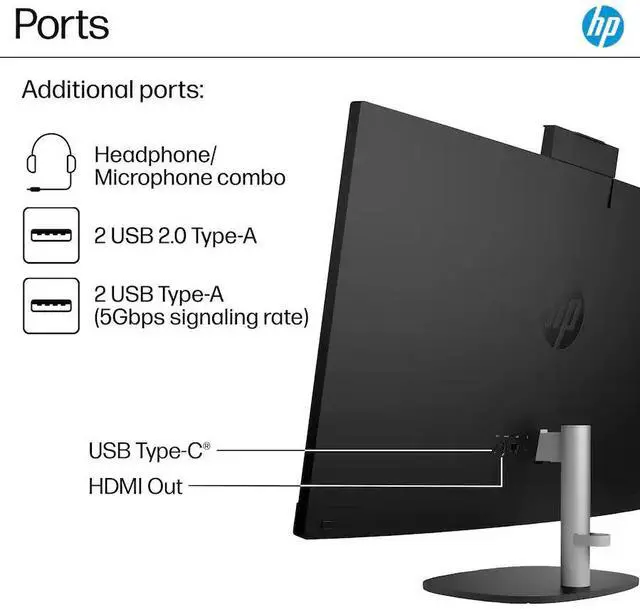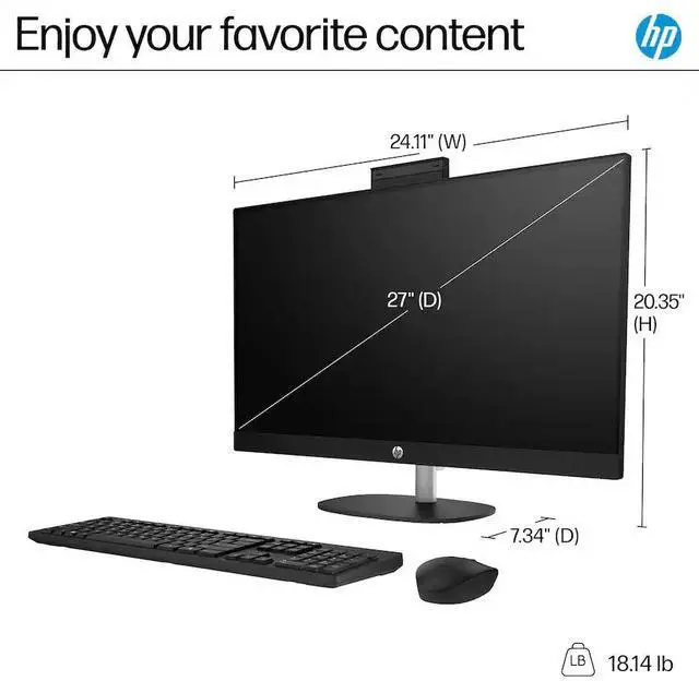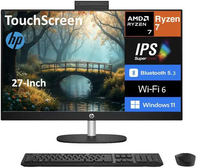 Model: HP 27 Form/Style: All in OneProcessor: Zen 3 Gen AMD Ryzen 7 7730U 2.00GHz Processor (upto 4.5 GHz, 16MB Cache, 8-Cores, 16-Threads, )Memory: 16GB DDR4 SO-DIMMGraphics: AMD Radeon Integrated Graphics, Storage: 1TB PCIe SSD (Solid State Drive)Operating System: Windows 11 Home-64Display: 27" IPS FHD (1920x1080) 60Hz 16:9 Touchscreen DisplayConnectivity: 802.11ax Wifi, Bluetooth 5.3, RJ-45Ports/Slots:, 2 USB 2.0, HDMI, USB 3.2 Type-C, Headphone/Microphone Combo JackInput/Output: Webcam, Black, Wireless Keyboard, Wireless Mouse, Battery: 90W PSU, Other Features, Color: Jet BlackWeight: 12lbProduct Dimensions (WxLxH): 12.7 IN x 24.15 IN x 1 IN