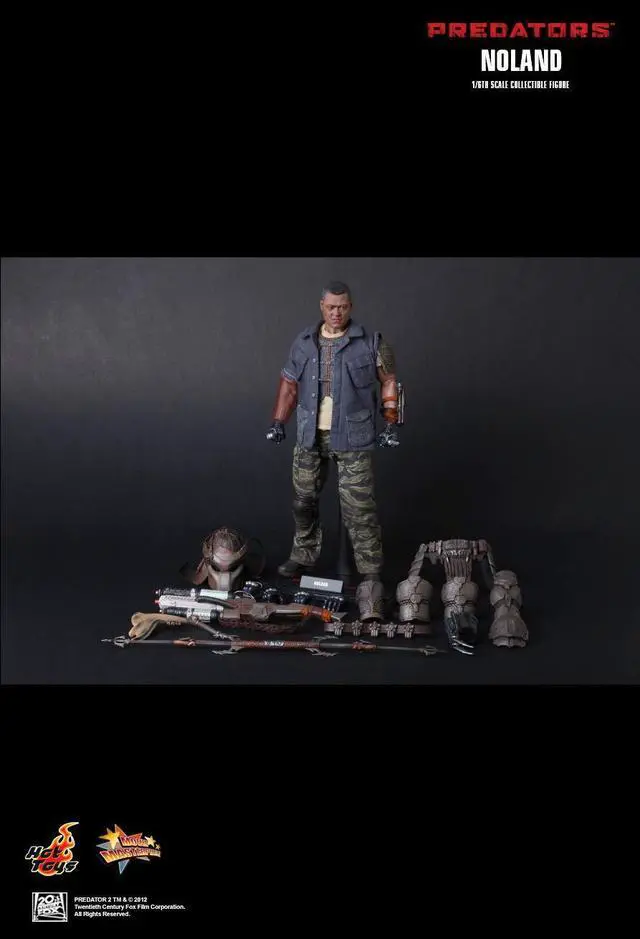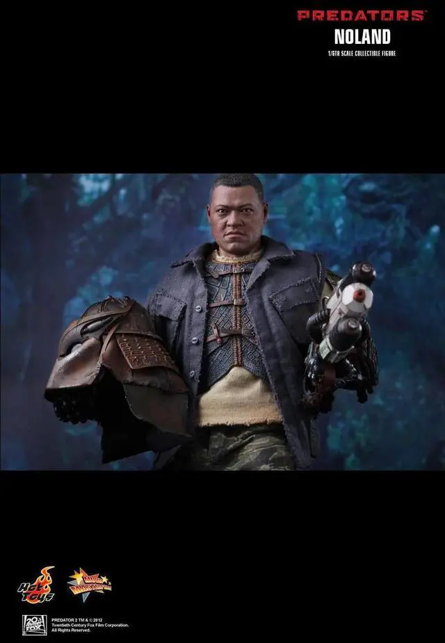 "I'm the one that got away. The one you don't @#$ with." Hot Toys presents the 1:6th scale Noland Collectible Figure from the movie Predators. The 12-inch tall movie-accurate Noland collectible features an authentic and detailed fully realized likeness of Laurence Fishburne as Noland in the movie, over 30 points of articulation and six (6) pieces of interchangeable palms. The figure's specially sculpted body armor and weapons include a detachable helmet with leather-like materials, leather-like skirt with waist band, one (1) pair of forearm armor with extendable blades on right hand side, one (1) laser gun, one (1) axe, and one (1) extendable spear. Figure comes complete with a display stand with Noland nameplate and movie logo.