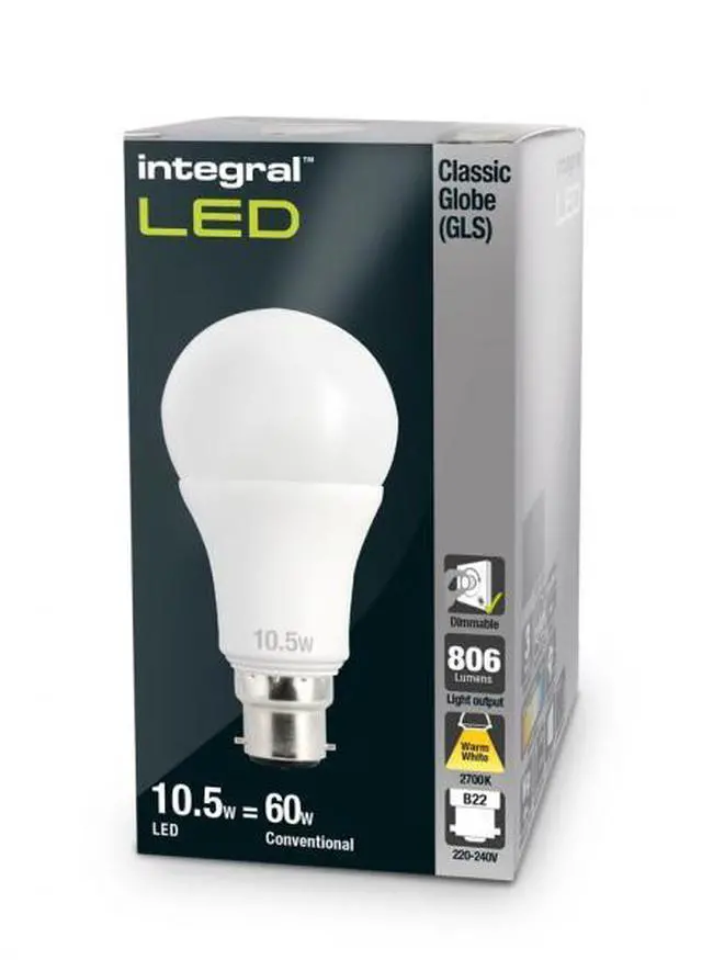 Classic Globe GLS LED 10.5W bulb, equivalent to 60W standard bulb. Warm White colour and fitted with B22 (Large Bayonet) cap. Dimmable LED bulb, 806 lumens, voltage range 220-240V, lifetime up to 25, 000 hours. rnrnThis Integral 10.5W retro-fit Integral LED Classic Globe (GLS) (large bayonet base) delivers a dimmable, warm white light and brightness, similar to a 60W filament bulb. It features high output, multi Everlight LEDs, an anti-glare refractor, all finished in an aluminium and plastic, thermally efficient body. Ideal for living rooms, hallways and kitchens.