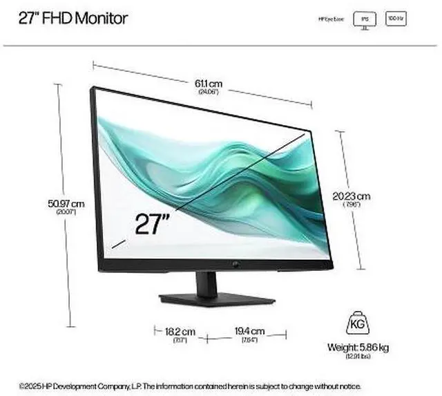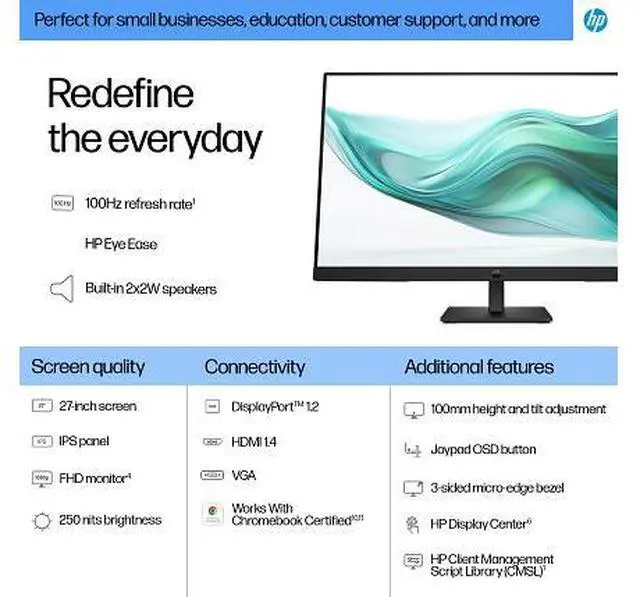OverviewExpand your view in comfort with a spacious, thoughtfully designed 27 inches of workspace. Boasting a crisp, smooth screen and a simple yet functional design, this HP Series 3 Pro 27" FHD monitor lets you work better all day. Height adjustable; TiltWhat's in the box? Monitor; DisplayPort cable; HDMI cable; Warranty card; AC power cable; Quick Setup PosterDisclaimers All performance specifications represent the typical specifications provided by HP's component manufacturers; actual performance may vary either higher or lower. 100 Hz refresh rate can be supported via HDMI and DisplayPort cable connection only.