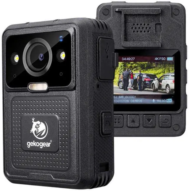 The GekoGear Aegis 400 Body Cam is the best wearable security tech to take with you anywhere, recording in up to 4K Ultra HD quality for crystal clear video. Utilizing a 130° wide-angle lens and 128GB of built-in memory, It can record for up to 10 hours of continuous recording. Afterward, easily review your recorded footage on the 2" LCD screen or transfer your videos to a PC/Mac with the supplied USB-C cable. Equipped with infrared night vision and an LED flashlight, record up to 10 feet in front of you in total darkness.