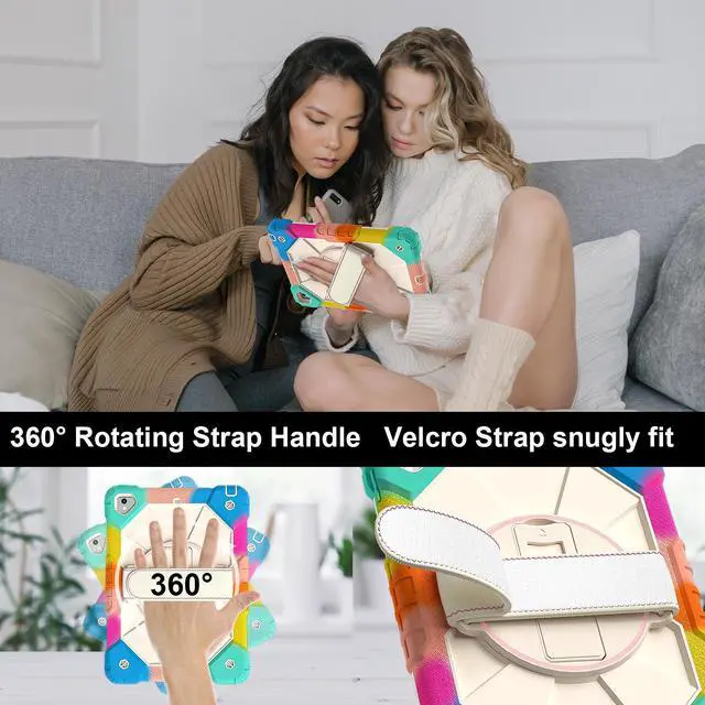 Built-in 360 Rotatable Kickstand + Hand Strap : 360-degree rotating swivel stand supports position of 3 angles(Vertical, Horizontal, and Halfway between), ideal for watching videos, conferences and travelling. Soft rotating handle strap prevents falling of tablet, featuring convenient use for school teachers, students, waiters, doctors, nurses and conference presenters.