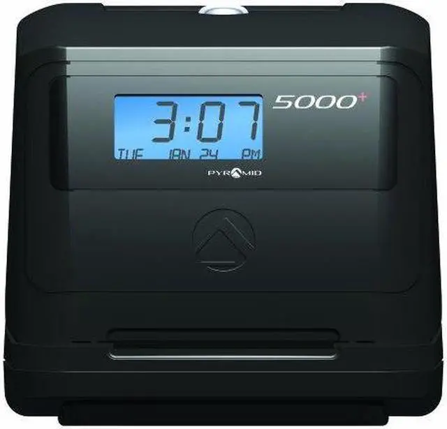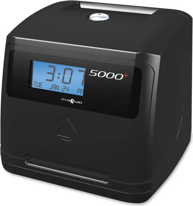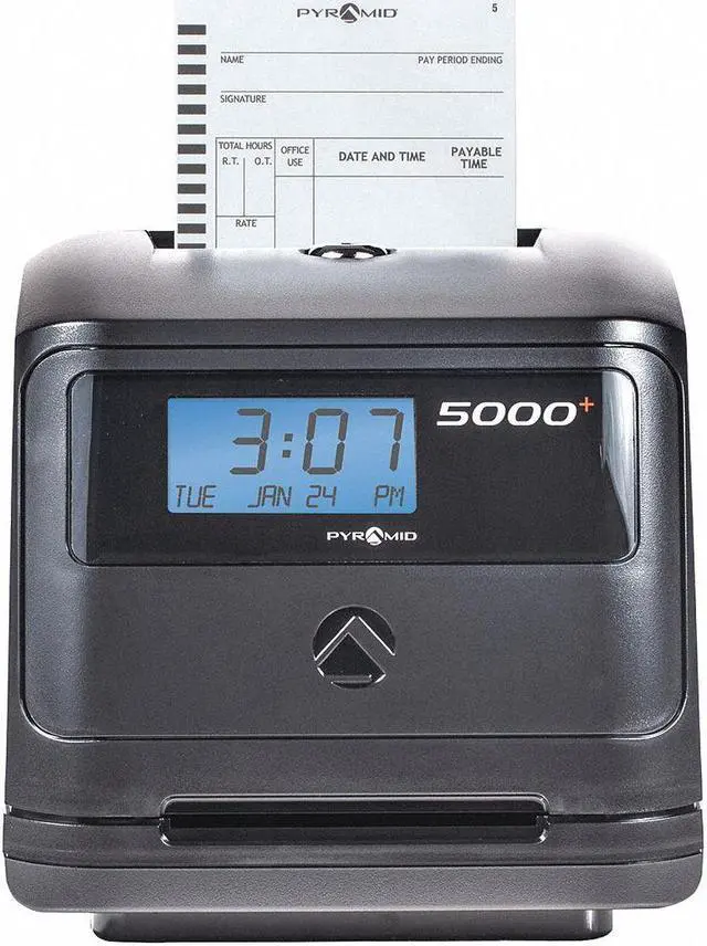 Handling up to 100 employees, this auto totaling time clock calculates worked time between punches and accumulates worked hours for weekly, bi-weekly, and semi-monthly for monthly pay periods. It totals actual or rounded time, including 5-, 10-, and 15-minute rules. Additional features include auto time card alignment and top loading, printing in English, Spanish, or French, automatic reset for short months, leap year, or Daylight Saving time, and a tamper-proof security lock. Time Clock, Digital, LCD