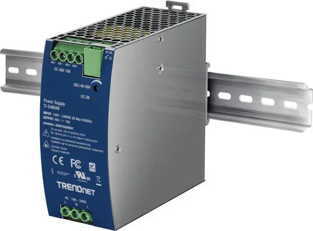 TRENDnets AC to DC Industrial DIN-Rail Power Supply with PFC Function, model TI-S48048, supplies up to 480W (48V DC, 10A) of power to industrial equipment such as PoE switches, network cameras, and WiFi access points. This DIN-Rail power supply comes with active PFC, an integrated DIN-rail mount, and overload current protection.