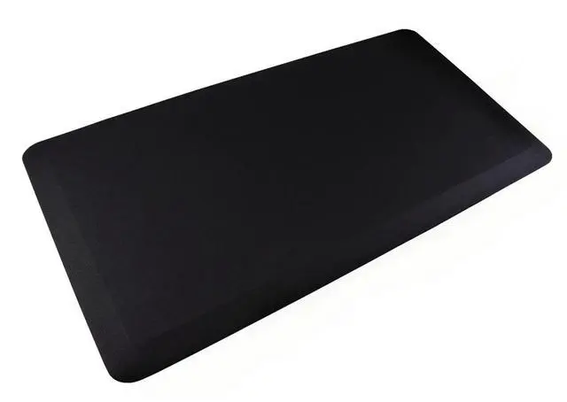 This strong and supportive mat is made from a single piece of polyurethane with an antimicrobial polyester covering to help make standing for long hours a more comfortable experience. The cushioned mat helps reduce pressure on the body, so you can work without distraction. Non-toxic and phthalate-free polyurethane construction is 1 solid piece that is 13/16" thick. Fine, antimicrobial polyester covering offers support and comfort over time. Designed to reduce strain on the feet, legs, knees and back joints. Beveled edging is ADA trip hazard compliant. Active antimicrobial ingredient helps keep bacteria from forming.