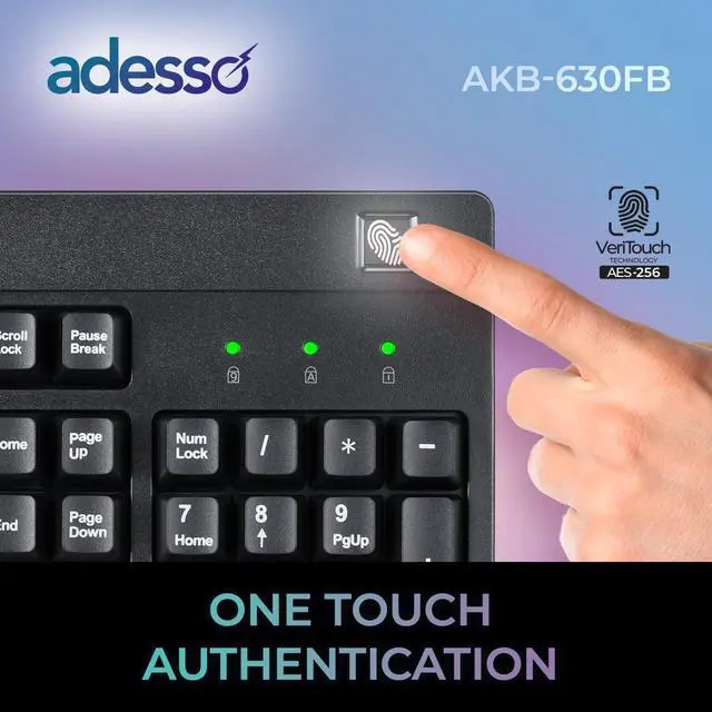 The Adesso AKB-630FB-TAA is a professional-grade fingerprint keyboard designed for secure environments requiring reliable biometric authentication. Made in Taiwan and TAA compliant, this full-size 104-key USB wired keyboard features enterprise-level security with AES 256-bit encryption and advanced fingerprint technology that can store up to 10 fingerprint IDs with 360-degree readability. The keyboard's durable membrane keys are rated for 5 million keystrokes, ensuring long-lasting performance. Compatible with Windows 7/8/10 and above including Windows Hello integration, the AKB-630FB is the perfect security solution for government agencies, military applications, educational institutions, healthcare facilities, and business environments where data protection is essential.