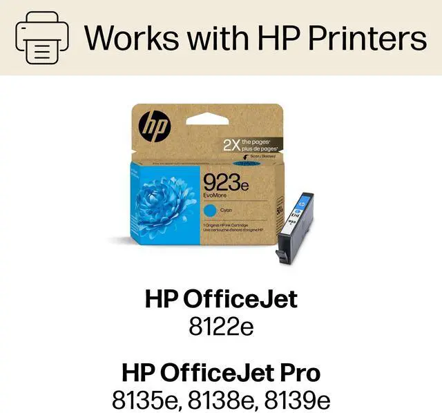 See how at http: //hp. com/EvoMoreCommunity. Disclaimers For OfficeJet and OfficeJet Pro 8120 and 8130 series printers when compared to standard Original HP Ink Cartridges for the same printer. See www. hp. com/EvoMoreLCA. HP 923e/924e/925e EvoMore Ink Cartridges have a lower carbon footprint compared to standard 923/924/925 Original Ink Cartridges when normalized to print 1, 000 pages. Based on LCA study conforming to ISO 14040/44 and third party verified. See www. hp. com/EvoMoreLCA HP 923e/924e/925e EvoMore Original Ink Cartridges compared to HP 923/924/925 standard Original Ink Cartridges. Page yield tested in HP OfficeJet Pro 8120 series. Average continuous printing yield of black and composite (cyan/magenta/yellow) based on ISO/IEC 24711 or HP testing methodology. Actual yield varies considerably based on content of printed pages and other factors. For details, see