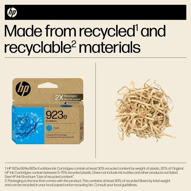 http: //www. hp. com/learnaboutsupplies. Program availability varies. See www. hp. com/recycle. Climate Impact Partners, The CarbonNeutral Protocol, certified CarbonNeutral product, 2024 edition, https: //www. carbonneutral. com/the-carbonneutral-protocol. The Lifecycle Assessments (LCA) are verified by independent third parties and comply with ISO 14040 and ISO 14044. HP uses these tests to determine the carbon footprint of the cartridges. We use this data to calculate the cartridge's CO emissions. Recycling compared to request-an-envelope process for standard Original HP Ink Cartridges for the same printer. Applies to HP 923e, 924e EvoMore Ink Cartridges. Only available in countries where cartridges can be returned through the mail. See www. hp. com/EvoMore for details. Customers can also drop off cartridges at collection sites. HP Planet Partners Program availability varies. For more information, visit www. hp. com/hprecycle. 2021 RPET and RPP Four Elements Consulting Life Cycle Assessment (LCA), commissioned by HP. Packaging is the box that comes with the product. This contains at least 90% of recycled fibers by total weight and can be recycled in your local paper/carton recycling bin. Consult your local guidelines. The HP EvoMore Community is a compensation program to help offset the impact of HPs environmental activities by supporting large-scale reforestation efforts to restore high priority forests and wildlife habitats.