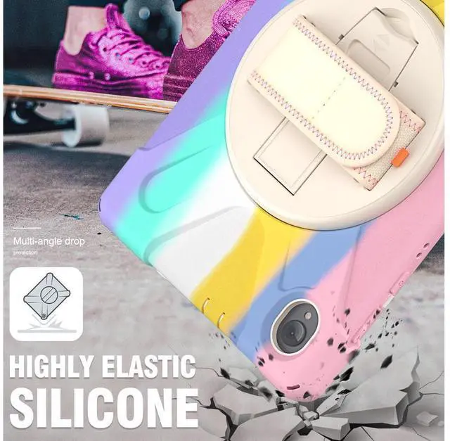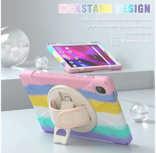 BUILT-IN KICKSTAND + ADJUSTABLE HAND STRAP + PORTABLE SHOULDER STRAP: 1: 360 degree stand is convenient for vertical/horizontal watching videos, typing, and conference. Free your hands! 2: Soft leather fabric Hand strap is adjustable and helps hold the center gravity of your tablet. 3: Nylon cross-body strap can help carrying with a more secure way during hiking, traveling, and car seat. Perfect choice for active people and outdoor gamers!