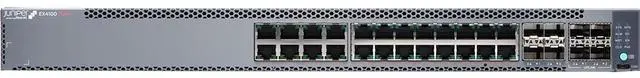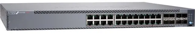 Juniper Networks EX4100, 24-port 10/100/1000BASE-T switch, 4x10GbE uplinks, 4x25GbE stacking/uplink ports, MACsec AES256, redundant fans | EX4100-24T