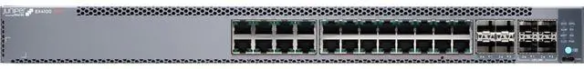 Juniper Networks EX4100, 24-port 10/100/1000BASE-T PoE+ switch, 4x10GbE uplinks, 4x25GbE stacking/uplink ports, MACsec AES256, redundant fans, 1x JPSU-920-AC-AFO included | EX4100-24P
