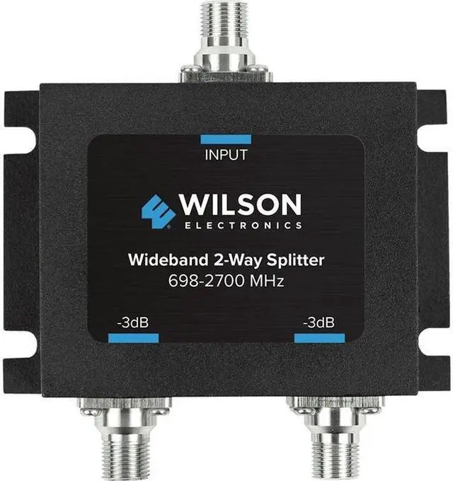 QUALITY CELL PHONE SIGNAL BOOSTER ACCESSORIES AND PARTS This product is a new replacement for Wilson 859993 -3 dB Splitter 75 Ohm. The 850034 2-way splitter is a -3dB 75 ohm wide band splitter covering frequencies from 698 to 2700 MHz. Perfect for use in signal distribution systems to split the amplified signal with minimum signal loss and where an equal amount of signal is desired on two inside antennas in similarly sized areas. Wilson's splitters are encased in a solid weatherproof housing making it suitable for indoor and outdoor use. Comes with F-Female Connectors.