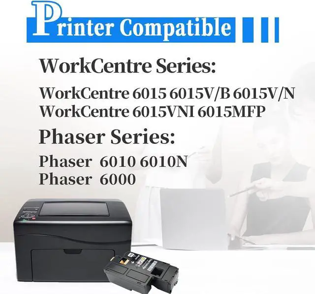 This affordable 6010 toner cartridge is compatible for Xerox Phaser 6010 6000 WorkCentre 6015 6015V/B 6015V/N 6015V/NI Printers in your office, in school, in hospital, at home and so on.