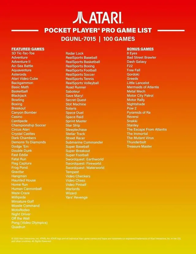 • Includes Asteroids®, Centipede®, PONG®, Breakout®, Missile Command®, Warlords® and many more.